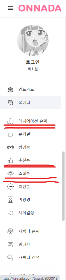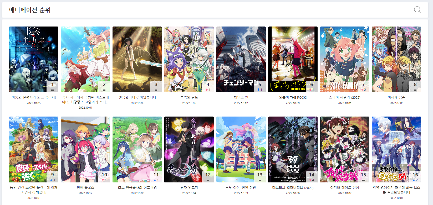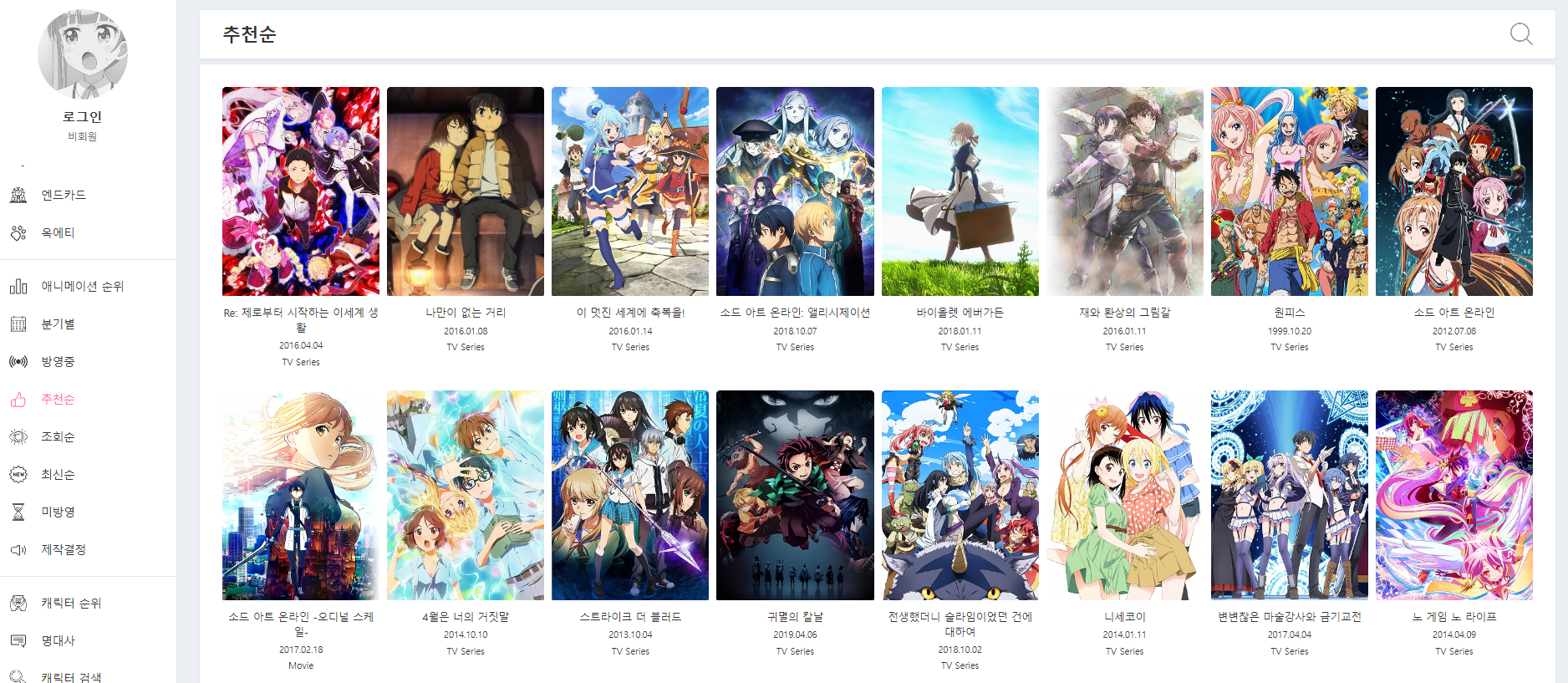 여기서 나는 주로 애니메이션 순위와 추천순, 그리고 조회순으로 볼 애니를 고른다. 특히 추천순을 많이 이용하는데 그 이유는 개인적으로 추천순으로 봤을 때, 확실히 내가 마음속으로 봤던 애니들의 순위와 비슷하게 맞아떨어졌기 때문이다.