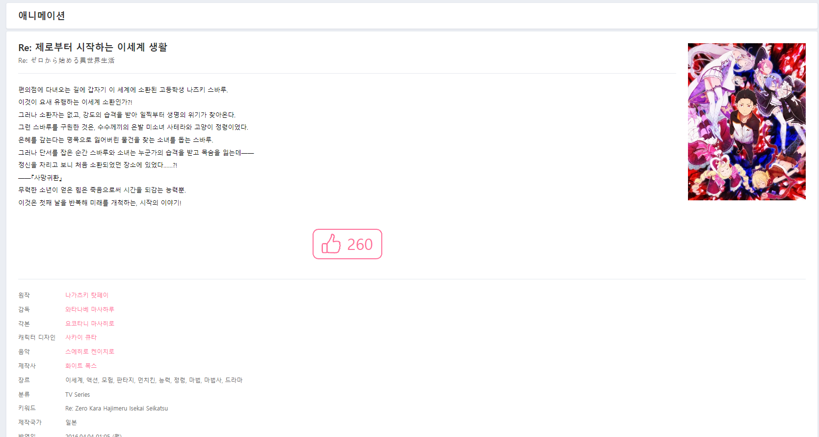 이런 식으로 정보가 나오니 자신이 원하는 장르와 입맛에 따라 보고 싶은 애니를 보면 될 것이다.